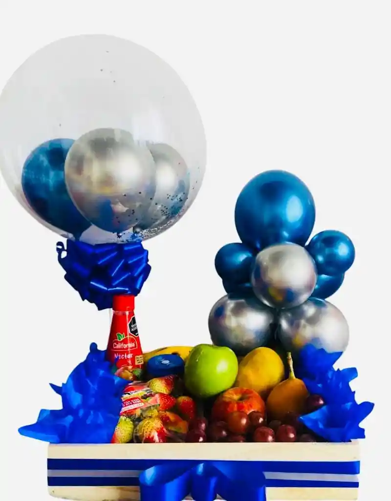 contiene manzana verde Manzana roja Pera Uvas Fresas Mango granadilla Banano 2 compotas Jugo de naranja o néctar Decoración Tarjeta personalizada