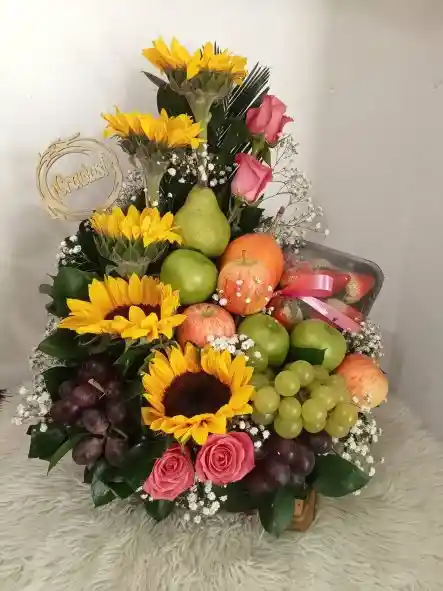 Hermoso arreglo floral elaborado con frutas manzanas verdes y rojas, uvas y granadillas, girasoles y rosas, follaje en una base de madera