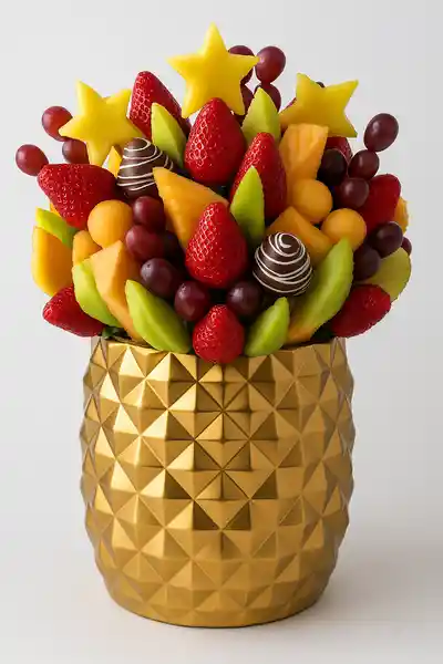 ¡¡Un arreglo que dice más que mil palabras: Gracias!!🤗 ✨ *Incluye:* Flores y estrellas de piña, uva, fresas, mango, manzanas, melón y fresas cubiertas de chocolate. 💌 Tarjeta dedicatoria incluida. 🎀 Envoltura en papel celofán con lazo de color. 📦 Frutas sujetas a disponibilidad. 🏺Base de Cerámica. 📏 Tamaño 🔸 Extra Grande: (26x35 cm) – 109 porciones aprox.
