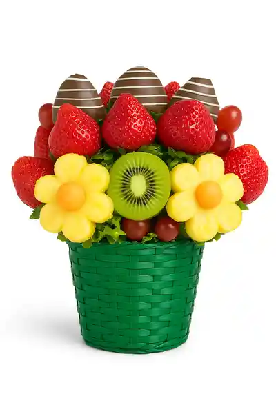 Frutas 🍇🍍🍏🥭que no solo conquistan el paladar, sino también el ❤️. ✨ Incluye: Deliciosas fresas cubiertas con el más exquisito chocolate blanco y negro, flores de piña, peloticas de melón. 💌Tarjeta dedicatoria incluida. 🎀 Envoltura en papel celofán con lazo de color. 📦 Frutas sujetas a disponibilidad. 📏Tamaños y precios: 🔸 *Grande (22x30 cm) 47 porciones aprox.
