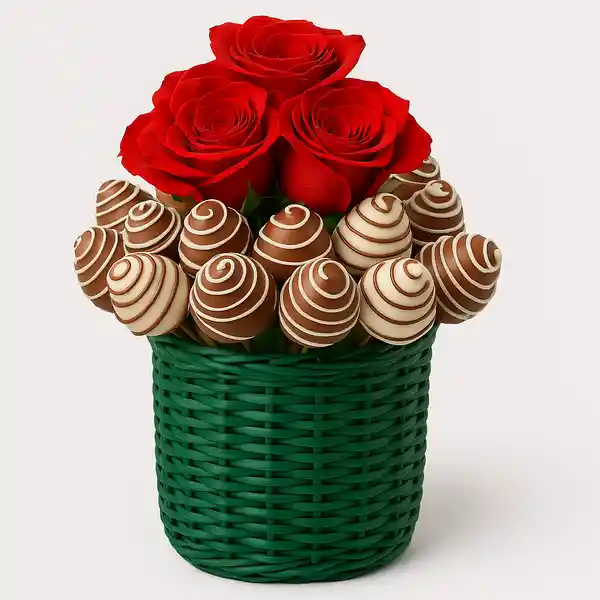 Fresas que no solo conquistan el paladar, sino también el ❤️. ✨ Incluye: Encantador arreglo de fresas cubiertas con chocolate blanco y negro, con bellas rosas rojas. 💌Tarjeta dedicatoria incluida. 🎀 Envoltura en papel celofán con lazo de color. 📦 Frutas sujetas a disponibilidad. 📏Tamaños y precios: 🔸 Mediano (20x25 cm) Contiene 20 fresas cubiertas de chocolate y 8 hermosas rosas.