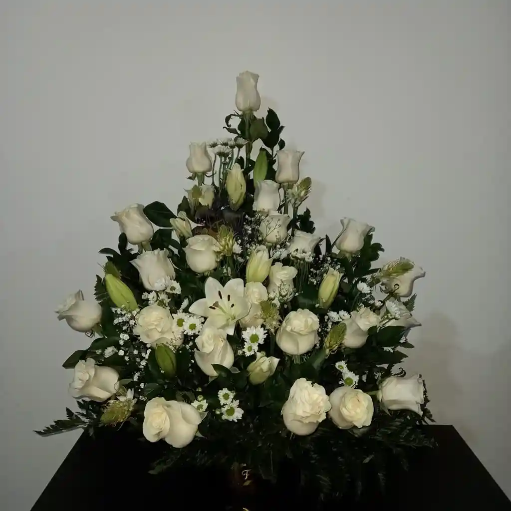Arreglo Floral para funeraria mediano con 20 Rosas Color a Disposicion , Varas de lirios color a Disposicion, Estrellitas , Follajes verdes y Blancos, en Base de madera, incluye moño, cinta membreteada y tarjeta con mensaje de condolencia