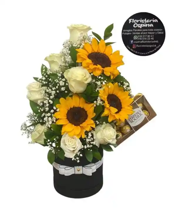 Un rayo de sol acompañado de dulzura. Este encantador diseño reúne la calidez de girasoles vibrantes con la delicadeza de rosas blancas y el toque etéreo de las gypsophilas, todo presentado en una elegante caja negra con detalle de moño blanco. Como broche de oro, viene acompañado de una deliciosa caja de chocolates Ferrero Rocher, perfecta para derretir corazones. Un detalle que alegra, enamora y conquista… solo de Floristería Ospina, donde cada flor tiene intención. 💌 Si deseas incluir una tarjeta personalizada, no olvides solicitarla al momento de la compra. 🎁 El diseño de la caja, moño y presentación de los chocolates puede variar según disponibilidad en tienda. 🎈 Puedes complementarlo con globos, peluches, licor o más chocolates según disponibilidad en nuestra tienda. 💬 Sugerencia de mensaje para la tarjeta: "Tu sonrisa ilumina mis días más que mil soles. ¡Gracias por existir!"