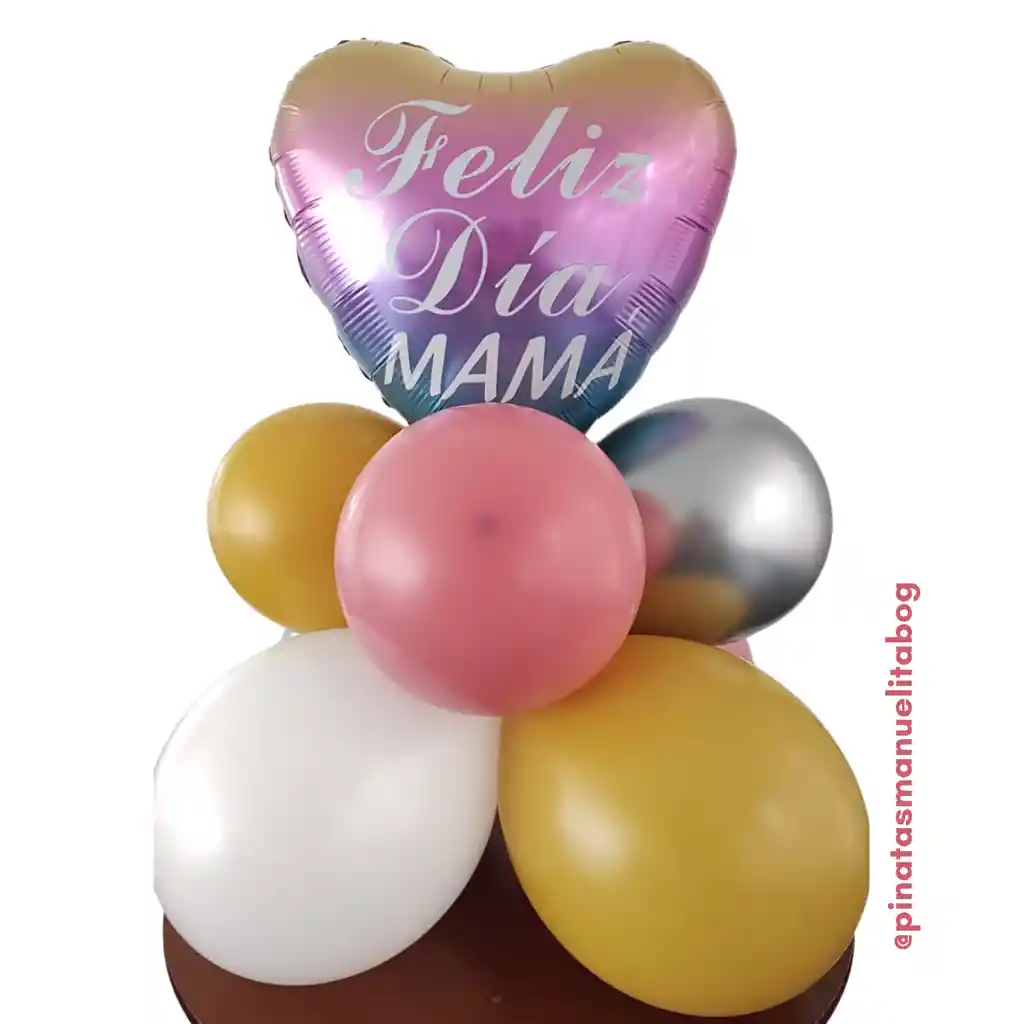 Base de globos inflados con aire en paleta de color durazno y palo de rosa + globo metalizado en forma de corazón con detalle de feliz día mamá, tiene un tamaño de 70 cm de alto. Tiene una duración de 3 días aprox. Dia de la madre, la mejor mamá, best mom, happy mother´s day.