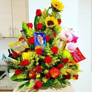 Arreglo Floral Elaborado Con 24 Rosas , Girasol , Soliaster Y Dracena . Incluye Variedad De Golosinas, Peluche , Caja De Ferrero Rocher Y Frutas .