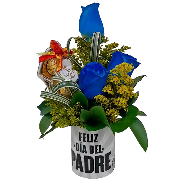 Mug Elaborado Con Rosas Azules 3 Und + Follaje en Solidaster + Rusco + Cintilla + Chocolates 2 Und. Motivo de Mug Sujeto a Cambio.