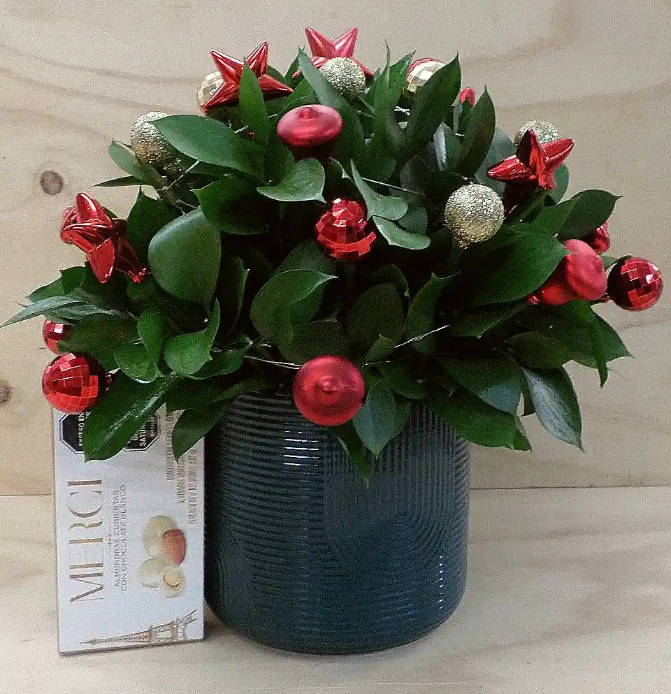 Arreglo Navideño Elaborado En Base Cerámica, Figuras En Colores Surtidos Y Follaje Natural, Con Luces Led De Pilas. Acompañado De Caja De Almendras Cubiertas De Chocolate Blanco Marca Merci x80 gr La foto es una imagen de referencia, los productos pueden variar según la disponibilidad.