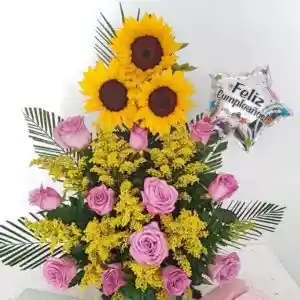 Arreglo Floral En Forma De Pino Con Rosas Y Girasoles + Globo Decorativo. de color Multicolor ideal para el Felicitaciones
