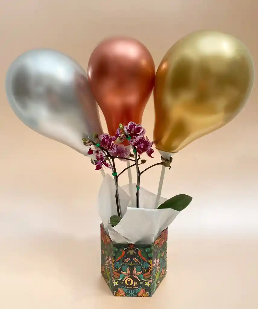 Arreglo de Orquídea mini empacada para regalo, con globos o bombas decorativas. Si deseas una tarjeta escríbelo en los comentarios. El color de la orquídea puede variar.