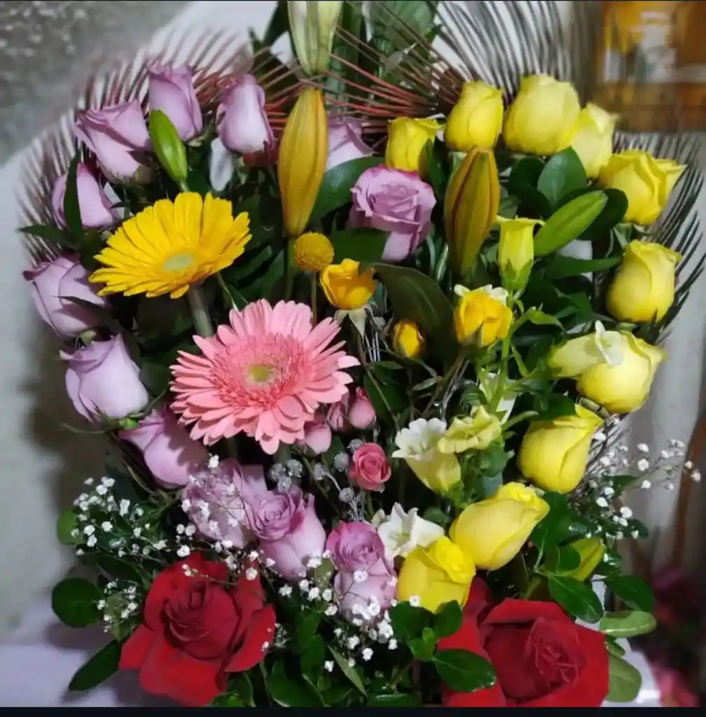 COLOR DE ROSA, SUJETA A DISPONIBILIDAD. Arreglo floral combina una variedad de rosas en tonos amarillos, lilas y rojos, junto con delicadas gerberas en tonos rosa y amarillo, creando una armoniosa composición que refleja la frescura y el espíritu alegre de la primavera. Los lirios aún por abrir y los detalles en blanco aportan elegancia y contraste, haciendo de este diseño una opción perfecta para ocasiones como cumpleaños, celebraciones o para llenar de color cualquier espacio. ¡Expresa alegría y buenos deseos con este encantador arreglo floral lleno de vida!