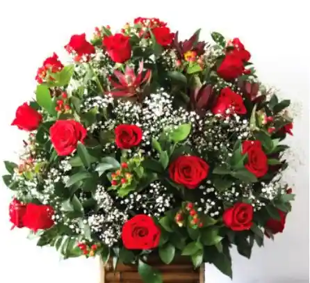 Arreglo en base de bambú con 24 rosas premium de exportación, hipérico, rusco, proteas, yipsophilia y tarjeta.