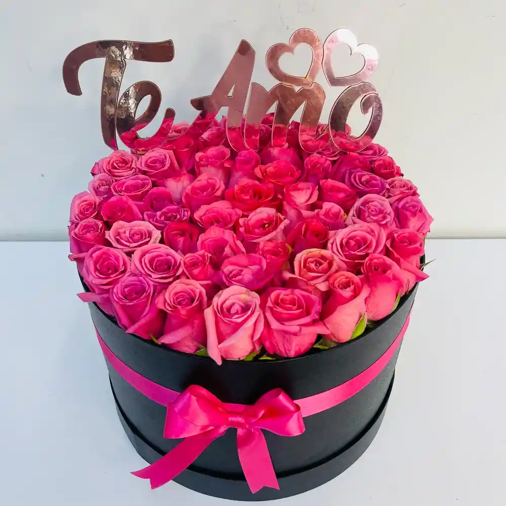 Cilindro con rosas perfectas en caja negra de lujo, acompañado de un cartel que dice “Te Amo”. Un detalle inolvidable para expresar amor de la manera más especial.
