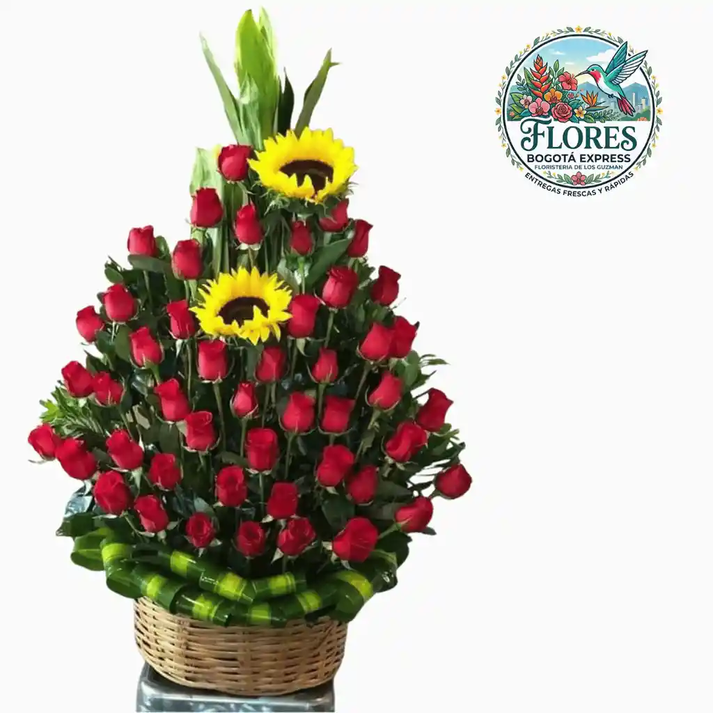 Hermoso arreglo floral elaborado con delicadas rosas rojas y vibrantes girasoles, diseñado en una elegante base de canasta con finos detalles de follaje verde. Su composición en forma ascendente transmite distinción, amor y admiración, mientras los girasoles aportan un toque de luz, alegría y energía. Ideal para sorprender en cumpleaños, aniversarios, celebraciones especiales o para expresar sentimientos profundos con un detalle inolvidable.