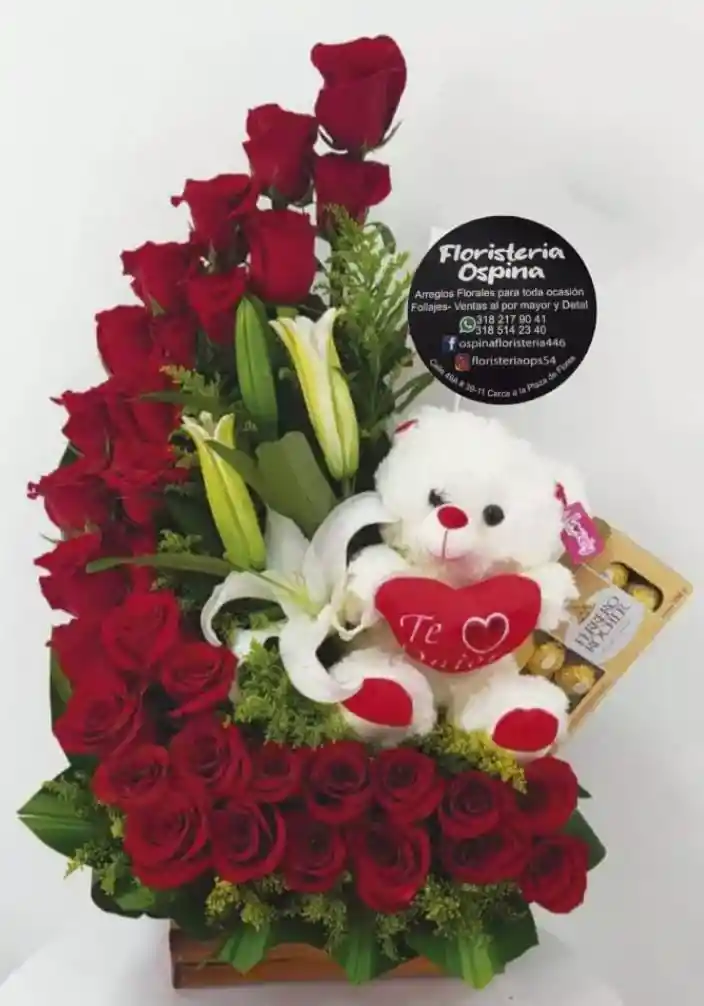 Arreglo en media luna elaborado con rosas rojas y lirios bancos, acompañado de un oso de peluche y chocolates finos por 8 unidades, en una base de madera