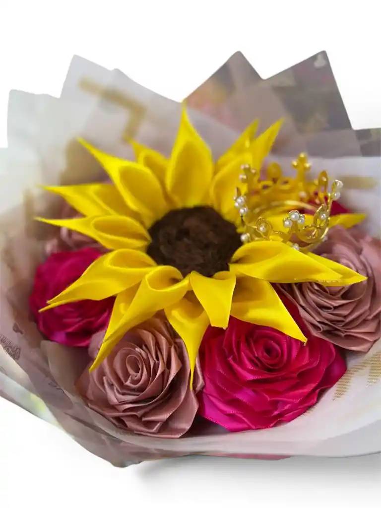 ARREGLO ROSAS ETERNAS "GIRASOL Y ROSAS PALO ROSA"
