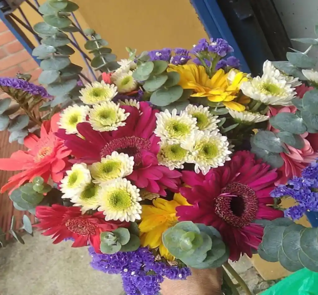 • 6 gerberas. • ½ paquete de astromelias. • ½ paquete de statice. • ½ paquete de pinochos. • ½ paquete de eucalipto. No incluye Jarrón/canasta. El color de la flor puede variar