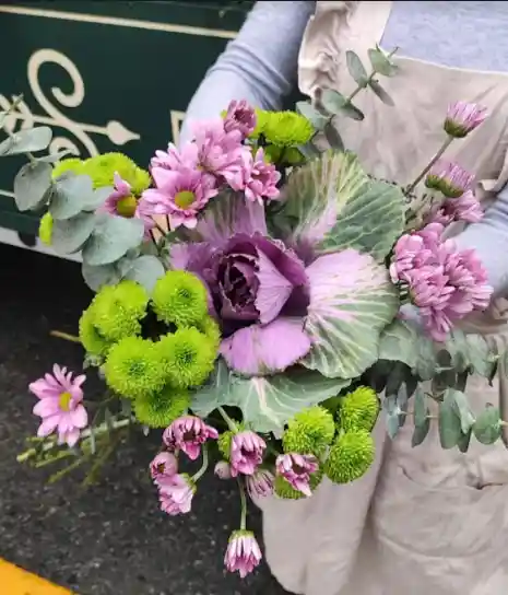 • 1 repolla. • 1 paquete de margarita pompón. • 1 paquete de pinocho. • ½ paquete de eucalipto. No incluye Jarrón/canasta. El color de la flor puede variar