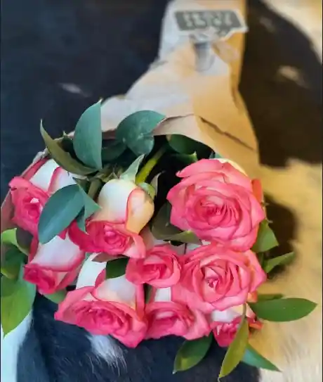 • 10 rosas. • ½ paquete de rusco. No incluye Jarrón/canasta. El color de la flor puede variar