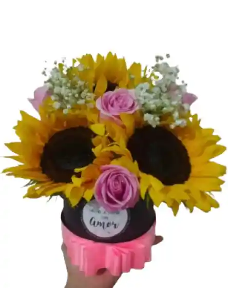 Contenido: 4 Girasoles 4 Rosas Rosada 1 Domo Decorada 1Tarjeta Personalizada