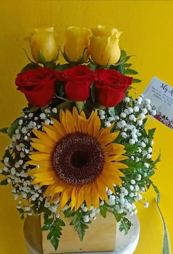Como los primeros rayos del sol que despiertan la esperanza y pintan el alma de alegría, “Amanecer de Amor” combina la calidez de un imponente girasol, la dulzura de rosas amarillas y la pasión de rosas rojas, en una armonía que vibra con sentimientos profundos y verdaderos. Rodeado de nube blanca y follaje verde, y presentado en una elegante base de madera, este arreglo es ideal para decir “te amo”, “te admiro” o simplemente “gracias por existir”. 📌 Si deseas incluir tarjeta, no olvides solicitarla al momento de tu pedido. Sugerencia de mensaje: "Tú eres mi sol, mi calma y mi razón para sonreír cada día." 🌻 Diseñado con amor por Floristería Ospina, donde cada flor nace con intención y florece para emocionar.