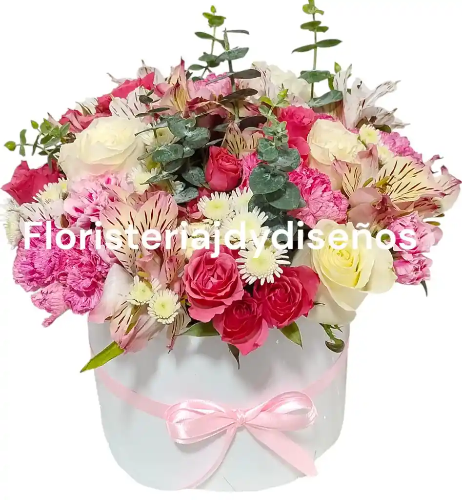 ARREGLO FLOLRAL TIERNO CON VARIEDAD DE FLORES(ROSAS,MINIROSA,CLAVELES,ASTROMELIAS, FOLLAJES(PERLA,EUCALIPTO) ELABORADO EN BASE DE LUJO PLASTICA"CILINDRO"Y DECORADA CON MOÑO EN CINTA DE TELA