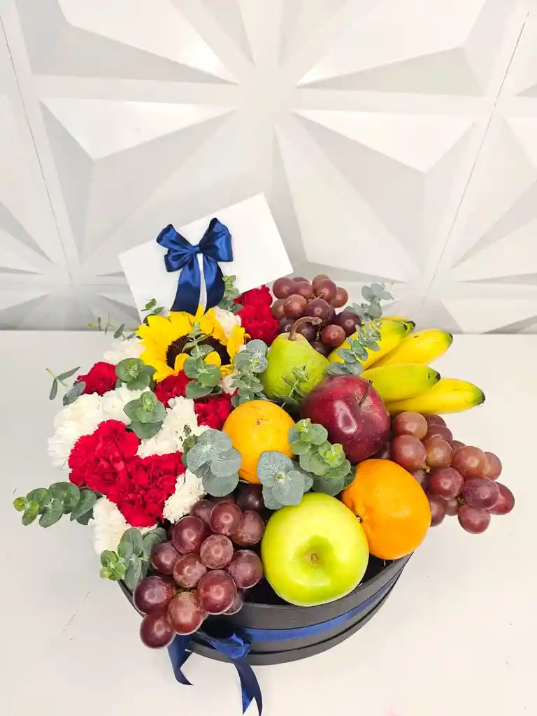 caja, frutas y flores surtidas (envianos mensaje de la tarjeta dedicatoria)