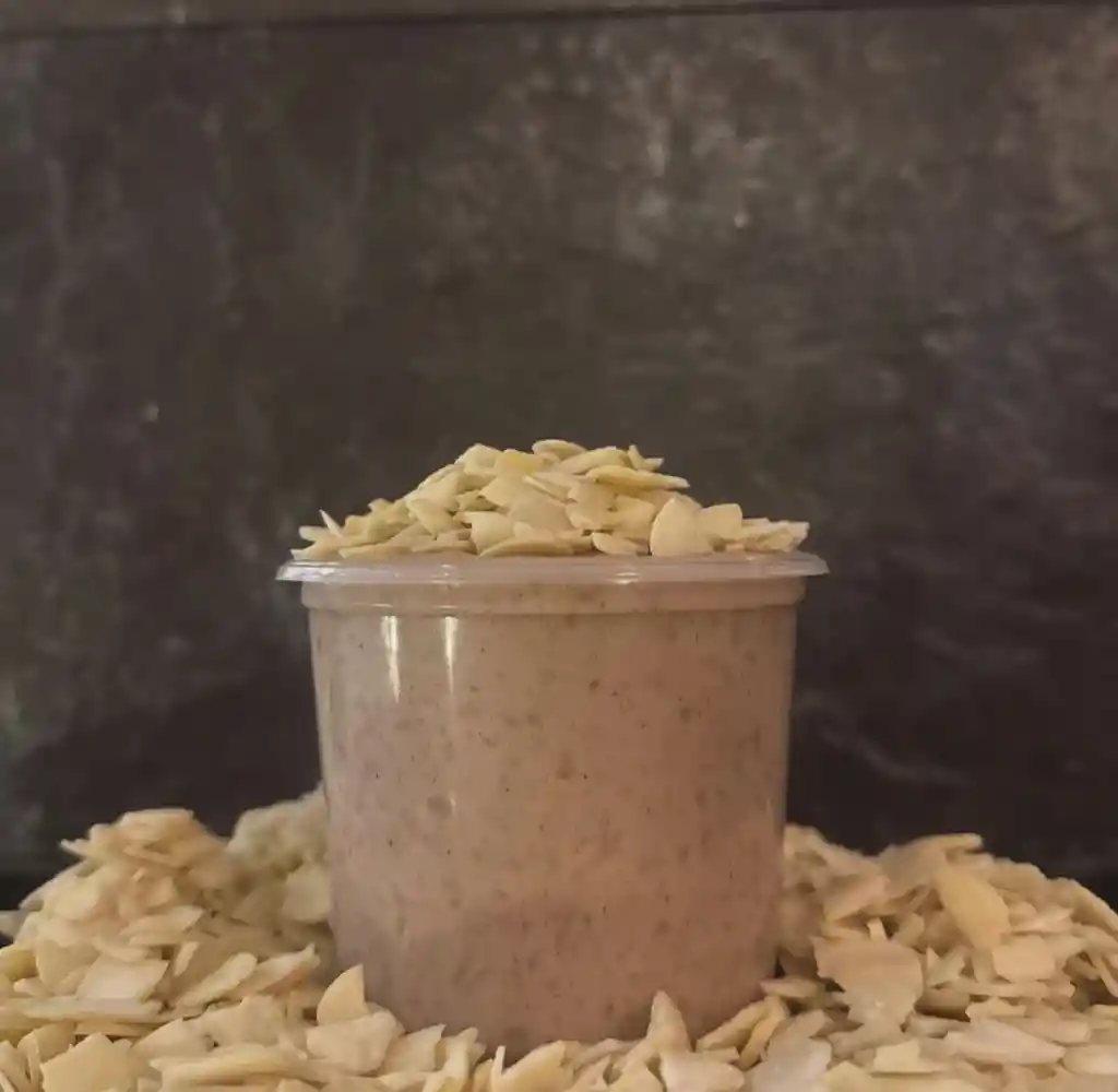 Arroz con leche de almendras cremoso, dulce cubierto de laminas de almendra.