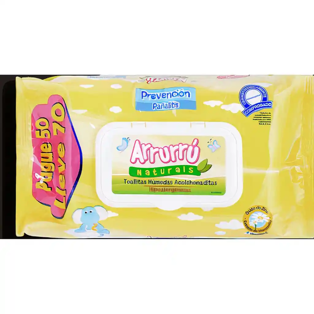 Las toallitas húmedas Arrurrú contienen extracto de áloe vera y manzanilla, certificados ingredientes que humectan, suavizan y protegen la piel en el área del pañal. Son libres de alcohol y parabenos. Hipoalergénicas, especialmente desarrolladas para la piel del bebé. packing: Bolsa