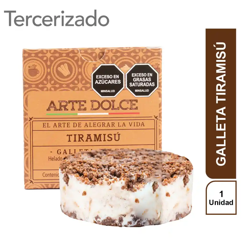 Dos capas de crumble de chocolate (Galleta) con gelato de Tiramisú en la mitad.
