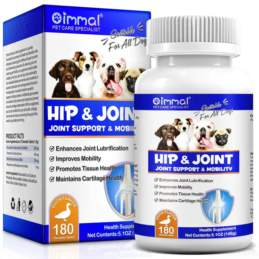 Oimmal Glucosamina y Condroitina para Perros – Suplemento Articular y Movilidad Hip & Joint 180 Tabletas Masticables Sabor Pato. Suplemento articular para perros con glucosamina, condroitina y MSM que ayuda a mejorar la movilidad, mantener el cartílago saludable y apoyar caderas y articulaciones. Oimmal Hip & Joint es un suplemento nutricional formulado para apoyar la salud articular y la movilidad en perros de todas las razas y tamaños. Su combinación de glucosamina, condroitina y MSM ayuda a mantener la flexibilidad, la lubricación de las articulaciones y el bienestar del cartílago, permitiendo que tu mascota se mantenga activa y cómoda. Las tabletas masticables sabor pato son fáciles de administrar y están diseñadas para el uso diario como parte de la rutina de cuidado de tu perro. Beneficios • Apoya la salud de caderas y articulaciones • Contribuye a la movilidad y flexibilidad • Ayuda a mantener el cartílago saludable • Promueve la salud del tejido conectivo • Favorece la lubricación articular INGREDIENTES ACTIVOS (por 2 tabletas) • Glucosamina HCl — 500 mg • Condroitina sulfato — 400 mg • MSM (Metilsulfonilmetano) — 250 mg • Manganeso — 5 mg OTROS INGREDIENTES Hígado desecado, fosfato dicálcico, celulosa microcristalina, sabor natural a pato, dióxido de silicio, ácido esteárico. MODO DE USO Administrar diariamente según el peso del perro: • Hasta 11 kg (25 lb): 1 tableta • 12–23 kg (26–50 lb): 2 tabletas • 24–34 kg (51–74 lb): 3 tabletas • Más de 34 kg (75+ lb): 4 tableta