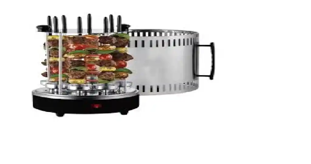 Diseño vertical giratorio : cocina de manera uniforme al girar automáticamente los pinchos. Capacidad : hasta 8 pinchos simultáneamente. Potencia : 1500W para un calentamiento rápido. Material : acero inoxidable resistente y fácil de limpiar. Incluye : pinchos, bandeja para grasa y tapa para conservación del calor. Ideal para : preparar brochetas, kebabs, anticuchos y más