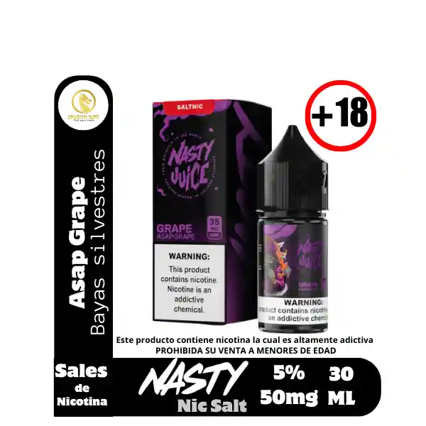 Esencia sal de nicotina Bayas silvestres y frutos morados sin mentol de la marca Nasty presentacion 30ml Nivel de nicotina 50mg-5% Ingredientes: Propilenglicol USP (PG), Glicerina Vegetal USP (VG), Saborizantes y Nicotina (opcional) PRODUCTO EXCLUSIVO PARA MAYORES DE EDAD PROHIBIDA SU VENTA A MENORES DE EDAD (18AÑOS)