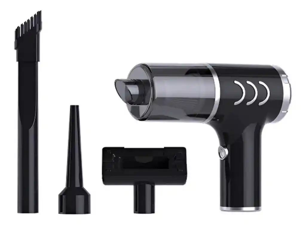 Esta aspiradora de mano multiuso es recargable y versátil, ya que brinda la posibilidad de utilizarla como aspiradora, inflador o para extraer aire. Su potente motor y filtro garantizan una succión eficaz, con un diseño portátil que permite acceder a los rincones más difíciles de limpiar. Potente rendimiento Aspirador inalámbrico 7.4 V 120W ~180*158*66 mm ~330g ~O.1L Funcionamiento silencioso Su motor es silencioso, con un nivel de ruido inferior a 84dB para una experiencia de limpieza tranquila. Boquillas versátiles Las diferentes boquillas incluidas te permiten alcanzar todos los rincones, asegurándote que todo esté limpio. Comodidad multiuso Se puede utilizar tanto en el hogar como en tu auto, y es ideal para limpiar computadoras y teclados,hogar ,autos etc Su diseño portátil e inalámbrico brinda comodidad al limpiar, pudiéndola utilizar para una infinidad de tareas. Carga USB