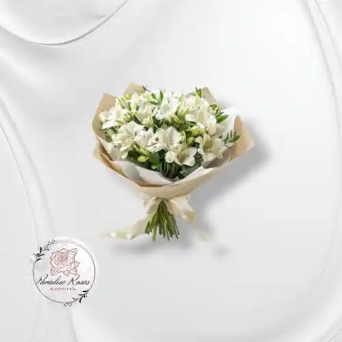 Elegante ramo de alstroemerias blancas,2 paquete, envuelto en papel kraft, Ideal para transmitir paz, gratitud y buenos deseos, condolencias o acompañamiento en momentos difíciles, Celebraciones espirituales o religiosas, Detalles corporativos elegantes. tarjeta personalizada escríbelo en el chat.