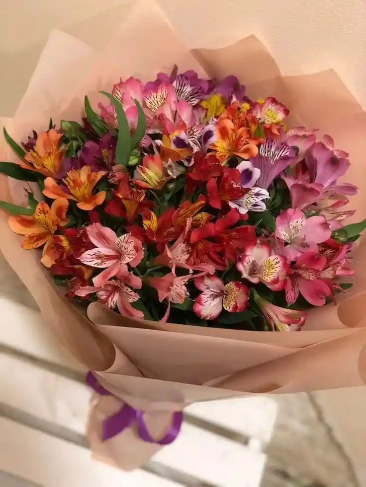 Incluye: Astromelias en tonos rojos, naranjas, rosado y morados, decoracion y mensaje personalizado