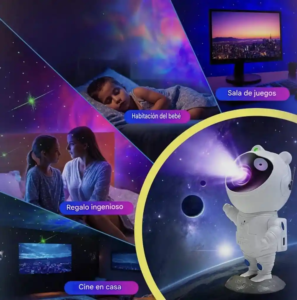 Incluye: Proyector Astronauta con Imán Mando a distancia Cable USB Manual de Uso Este hermoso proyector, te da la sensación que estas navegando en un espacio con cielo estrellado y nebulosas, te transmite calma y paz.