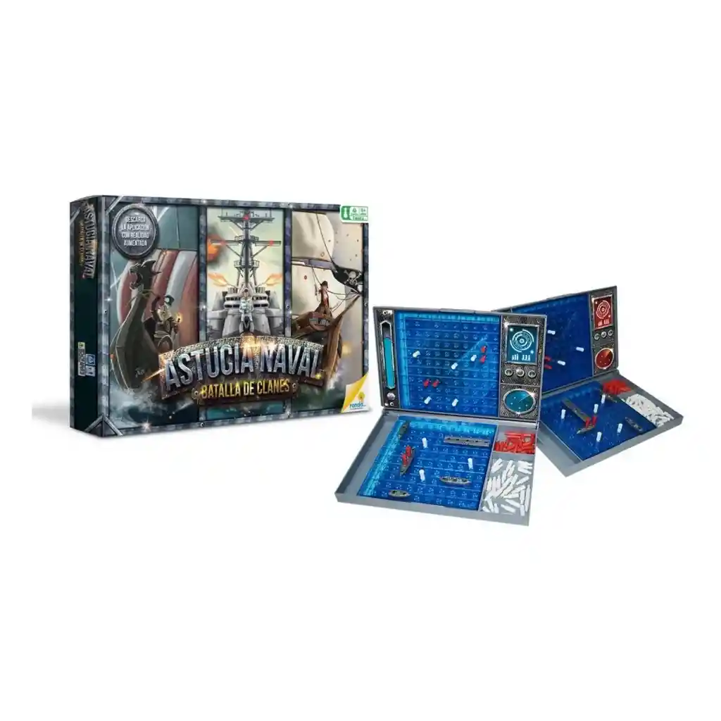 ASTUCIA NAVALMEDIDAS CAJA: 41,6 x 27,1 x 3,5 cm CONTENIDO: 2 Tableros de Juego 10 Barcos: 2 porta-aviones/2 Fragatas/2 Cruceros/2 Submarinos/2 Destroyers Fichas: 90 Blancas / 45 RojasElige tu clan, planea tu estrategia, apunta, dispara y se el ganador de esta gran batalla.