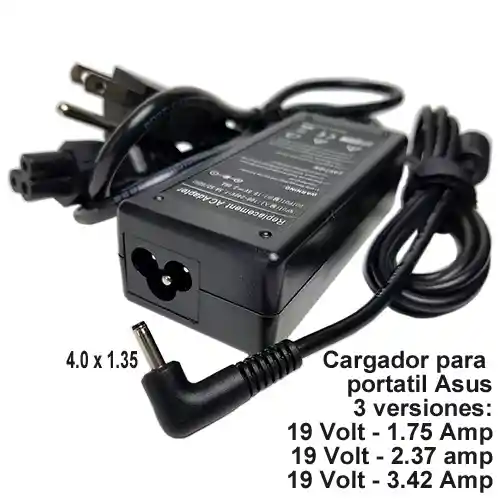 Cargador para computador portátil ASUS, maneja 19 voltios y 1,75 amperios, tamaño de punta de conexión de 4,0 x 1,35 mm, compatible con la gran mayoría de computadores de marca ASUS actuales. Maneja 90 días de garantía técnica (No cubre daños físicos, descargas eléctricas o humedad). Incluye cable de poder.