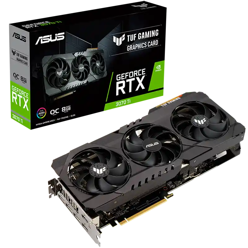 La TUF GAMING GeForce RTX 3070 Ti se ha desmontado y construido para proporcionar una potencia y refrigeración más sólidas. Una nueva cubierta totalmente metálica alberga tres potentes ventiladores de tecnología axial que utilizan cojinetes de ventilador de doble bola duraderos. La rotación del ventilador se ha optimizado para reducir la turbulencia, y un modo de parada detiene los tres ventiladores a bajas temperaturas. Debajo, los disipadores térmicos independientes para la GPU y la memoria mantienen las térmicas bajo estricto control. Las características adicionales, incluidos los componentes TUF, la tecnología Auto-Extreme, un nuevo soporte de GPU y una ventilación en la placa posterior, hacen que el TUF sea una potencia adecuada. Para los constructores que buscan un nuevo "viejo fiel", esta tarjeta tiene la espalda. Las tarjetas TUF Gaming aprovechan nuestro diseño de ventilador de tecnología Axial probado y verdadero, con tres ventiladores trabajando en conjunto para satisfacer las demandas térmicas del nuevo diseño de alto octanaje de NVIDIA. Los ventiladores se basan en rodamientos de bolas dobles para garantizar un rendimiento constante y una mayor longevidad en comparación con los rodamientos de manguito y otros tipos de rodamientos. Especificaciones: Motor gráfico: NVIDIA GeForce RTX 3070 Ti BUS: PCI Express 4.0 Memoria de video: GDDR6X de 8 GB Reloj del motor: Modo OC: 1815 MHz (Boost Clock) Modo de juego: 1785 MHz (Boost Clock) Núcleo CUDA: 6144 Velocidad de memoria: 19 Gbps Interfaz de memoria: 256 bits Resolución: Resolución máxima digital 7680 x 4320 Interfaz: Sí x 2 (HDMI 2.1 nativo) Sí x 3 (DisplayPort 1.4a nativo) Compatibilidad con HDCP Sí (2.3) Soporte de pantalla máximo: 4 Dimensiones: 299,9 x 126,9 x 51,7 mm 11,81 x 5 x 2,04 pulgadas PSU recomendada: 750W Conectores de poder: 2 x 8 pines Garantía: 12 meses