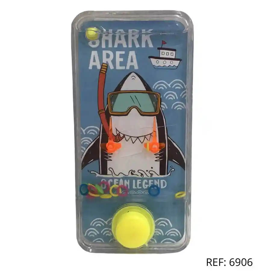 Mini juego de agua con aros, diseño de tiburón con gafas. Ideal para entretener a niños en cualquier lugar.