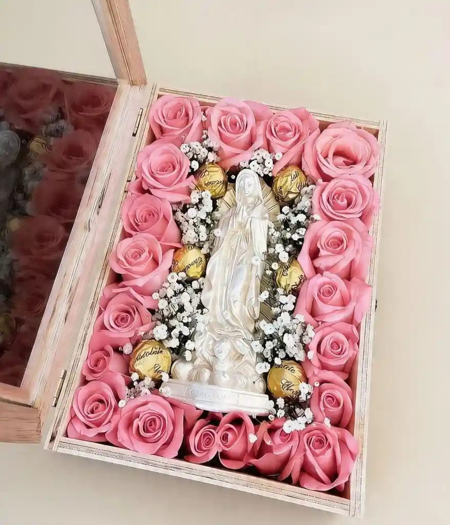 Caja de virgen mas chocolates tipo ferrero, con rosas rosadas