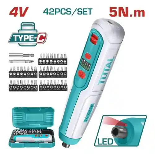 Atornillador Inalámbrico 4v Caja Plastica 43pzs Super Total Frecuencia: 50 60hz. Voltaje: 4V. Incluye 43 puntas y estuche rígido para organizar y transportar el conjunto completo de accesorios en un solo espacio. El mandril de 6.35 mm permite intercambiar puntas con encastre de 1/4 para realizar diversas tareas de fijación. La batería de ion de litio cuenta con un amperaje de 800 mA para sostener el funcionamiento durante las aplicaciones. La velocidad máxima de 240 rpm permite completar el ajuste de tornillos con un torque máximo de 5 Nm de fuerza. Integra una luz LED que ilumina directamente el área de trabajo sobre el tornillo para visualizar mejor la superficie. El diseño compacto permite maniobrar la herramienta en espacios reducidos durante el montaje de diversos elementos.