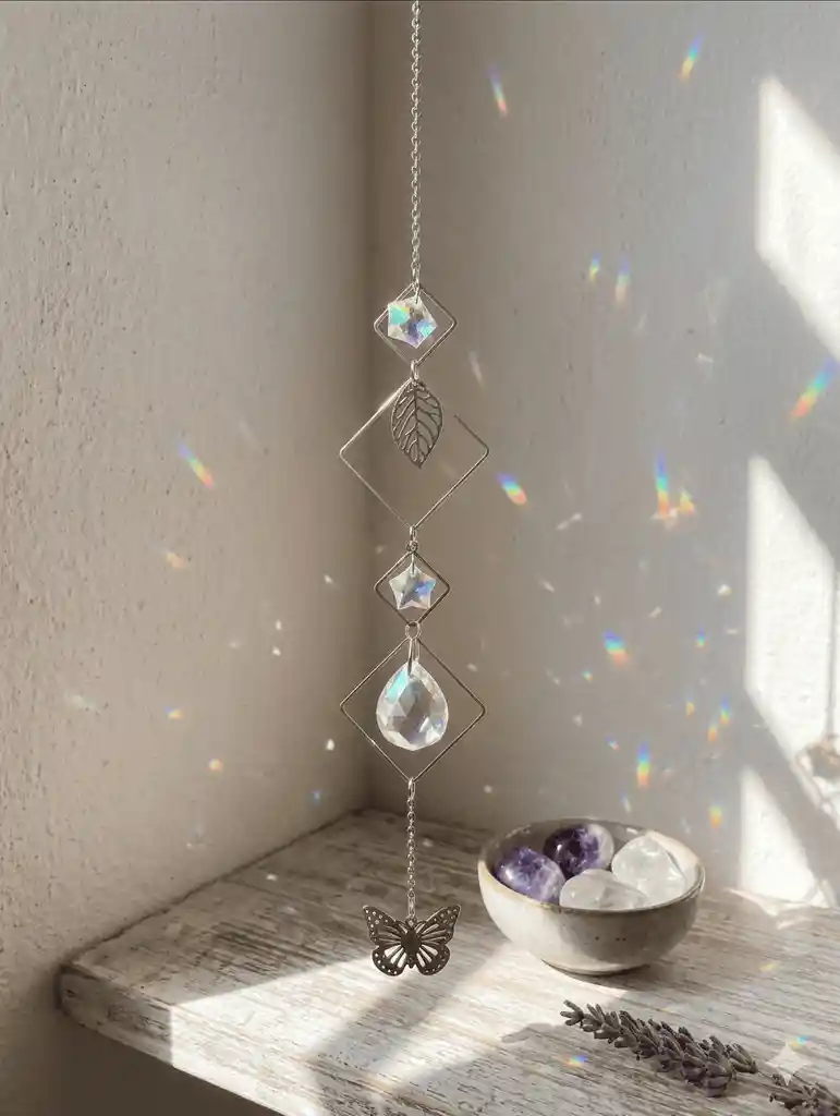 Atrapasol con cristales, dijes de hoja y mariposa. Energéticos y bonitos.