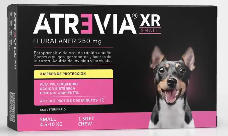 Atrevia® XR Small otorga un efectivo tratamiento ectoparasitario sistémico contra pulgas, garrapatas y ácaros, en base a fluralaner, que protege a los perros por 3 meses. Puede utilizarse en animales infestados o como preventivo. Empieza su acción en 90 minutos y mata a las pulgas en 8 horas y a las garrapatas en 12 horas.