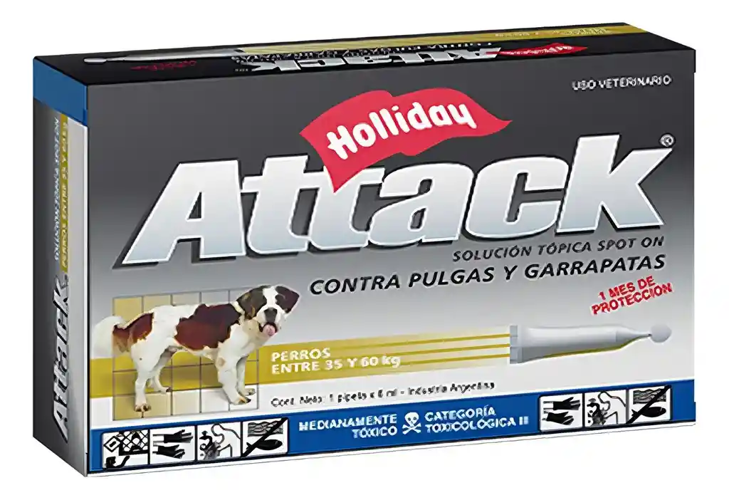El tratamiento antiparásitario Attack está diseñado para perros de entre 35 y 60 kg, brindando una solución efectiva y durable contra pulgas y garrapatas. Su formato de pipeta permite una aplicación sencilla y rápida, garantizando que tu mascota reciba el cuidado necesario sin complicaciones. Proporciona una protección mínima de un mes, asegurando el bienestar de tu mascota en todo momento. Además, su fórmula es resistente al agua, lo que permite que la protección se mantenga incluso después del baño o en días de lluvia. El producto viene en un envase de 6 mL y un peso total de 50 g, lo que facilita su manejo y almacenamiento. Al elegir Attack, puedes estar seguro de que tu perro estará protegido de parásitos, mejorando su calidad de vida y manteniendo tu hogar libre de infestaciones. Garantía del vendedor: 30 días