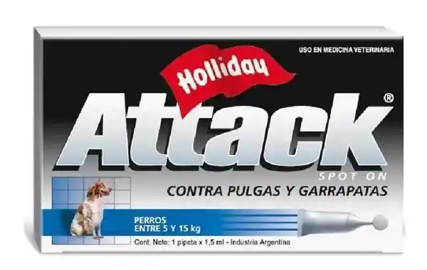 ACCIÓN El producto 'Attack Perros De 5 A 15 Kg 1.5 Ml' es un antiparasitario externo pulguicida garrapaticida, repelente. Contiene imidacloprid, un neonicotinoide que actúa sobre los receptores de acetil colina, causando parálisis y la muerte del parásito. Este componente tiene acción contra las pulgas en estado larvario y adulto. También contiene cifenotrina, un piretroide de origen natural, que actúa como repelente de insectos alterando el paso de iones sodio a través de la membrana plasmática. La combinación de estos dos componentes funciona como repelente de garrapatas y mosquitos. INDICACIONES Este producto es útil para la prevención y tratamiento de infestaciones por pulgas(Ctenocephalides canis / felis) y garrapatas (Rhipicephalus sanguineus). También es repelente de moscas y mosquitos. FÓRMULA Cada 1,5 ml de la solución contiene: Imidacloprid 100 mg Cifenotrina400 mg Excipientes c.s. POSOLOGÍA Y ADMINISTRACIÓN Para perros: Imidacloprid 10 mg/kg/ Cifenotrina 40 mg/kg equivalente a 1.5 ml cada 10 kg de peso Hasta 5 kg : 1 pipeta de 0.75 ml De 6 a 10 kg: 1 pipeta de 1,5 ml De 11 a 20 kg: 1 pipeta de 3 ml. De 21 a 40 kg: 1 pipeta de 6 ml. De 41 a 60 kg: 1 pipeta de 9 ml . Se recomienda repetir la aplicación cada 4 semanas. Forma de uso: 1) Para destapar la pipeta, girar el cierre hasta desprenderlo. 2) Colocar la pipeta sobre la piel entre escápulas con el pico dosificador hacia abajo. 3) Ejercer leve presión sobre la pipeta para descargar la totalidad del contenido entre las escápulas y el lomo del animal. 4) Para facilitar la aplicación el animal debe estar parado. CONTRAINDICACIONES No se debe utilizar el producto en cachorros menores a las 8 semanas de edad. No se recomienda su uso en caso de hipersensibilidad a alguno de sus principios activos. EFECTOS COLATERALES En algunos animales de piel muy sensible, puede provocar una reacción cutánea en el punto de aplicación que no reviste gravedad. Se recomienda realizar pequeñas topicaciones para evitar que el producto se concentre en un sólo punto. RESTRICCIONES DE USO No aplicar el producto en zonas donde pueda lamerse. Aplicar únicamente sobre piel sana. Garantía del vendedor: 30 días