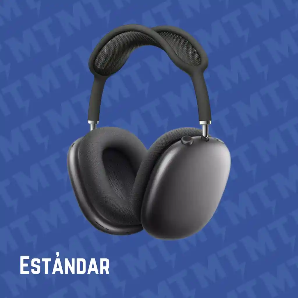 Audífonos inalámbricos tipo AirPods Max de color negro. Cuentan con cancelación activa de ruido y sonido de alta fidelidad ofrecen hasta 12 horas de audio con una sola carga. Incluye: - AirPods Max. - Smart Case. - Cable USB-C a USB-C. Calidad: Estándar.