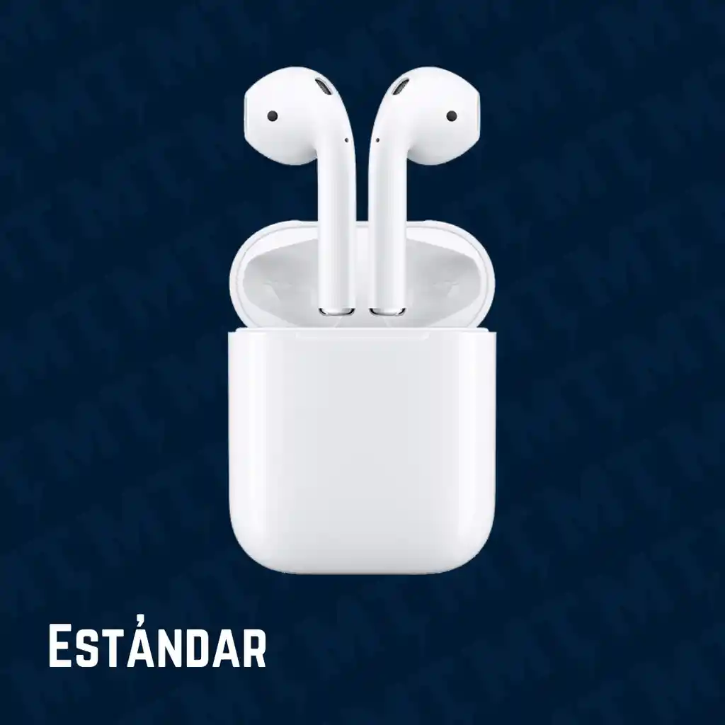 Audífonos inalámbricos tipo AirPods 2. Ofrecen hasta 5 horas de audio con una sola carga. Incluye: - AirPods 2. - Estuche de carga con puerto Lightning. - Cable USB-A a Lightning. Calidad: Estándar.
