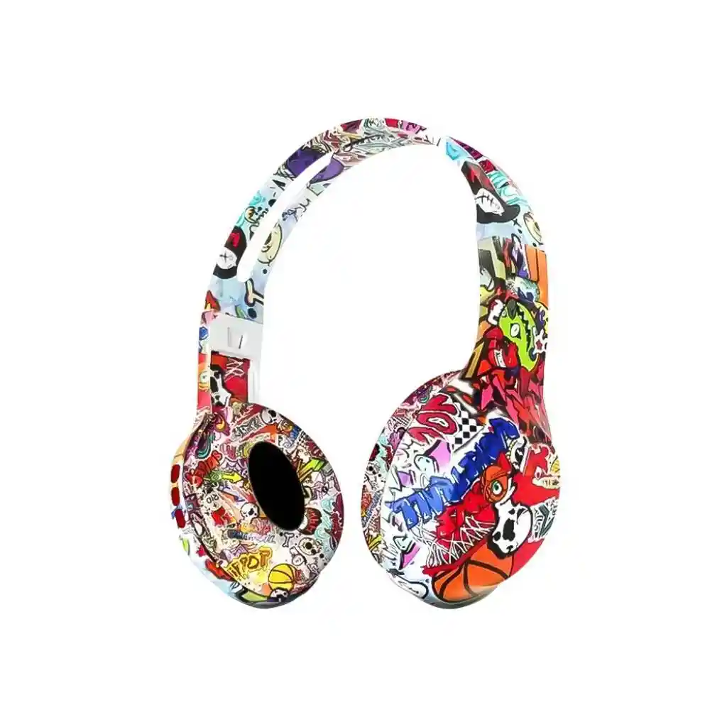 Especificaciones *Audífonos bluetooth con diseños de grafitis *versión 5.1 *rango de alcance 10m * frecuencia 20HZ *batería 150mAH *tiene capacidad para memoria extraíble hasta 32gb *tiempo en uso continuo 4 horas *audífonos ergonómico con almohadillas para mayor confort *entrada auxiliar