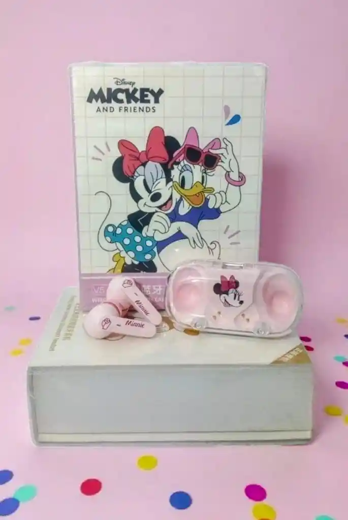 Audífonos Bluetooth Minnie Mouse Disney Inalámbricos con Estuche de Carga Disfruta de tu música favorita con el encanto único de Minnie Mouse. Estos audífonos inalámbricos Bluetooth edición Disney Mickey and Friends ofrecen sonido estéreo de alta calidad, diseño cómodo y moderno en color rosa pastel. Incluyen un práctico estuche de carga transparente decorado con Minnie, ideal para llevar a todas partes. Compatibles con la mayoría de dispositivos móviles y perfectos para regalar a fanáticos de Disney. Características principales: •Conexión Bluetooth V5.0 •Diseño ergonómico y ligero •Estuche con ilustración de Minnie Mouse •Sonido estéreo de alta fidelidad •Color: Rosa pastel •Ideal para uso diario, viajes o regalos